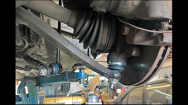 ![]() 交換後の左ボールジョイントと左ロッドリンク。 激しく動く部分だけに劣化は避けられないですね。 |