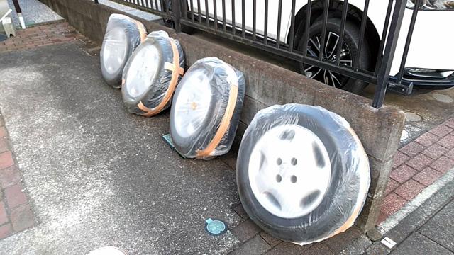 ![]() さて作業開始。冬タイヤを前後に並べます。路上整備ですが、基本宅配便しか通りません。 |