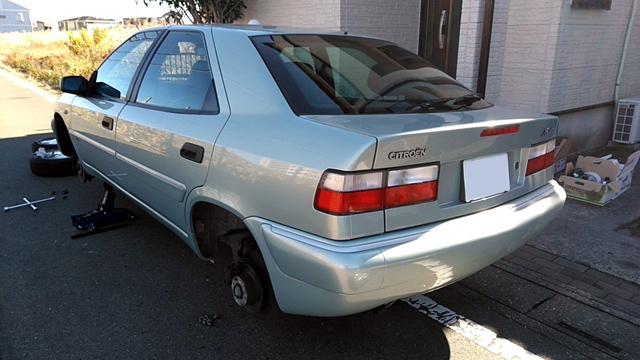 ![]() ジャッキアップして作業中の図。いつも通り前後同時交換です。 因みにこのジャッキ、リフト高さ(36CM)は、エグの整備にはちょっと低かった様です。 |